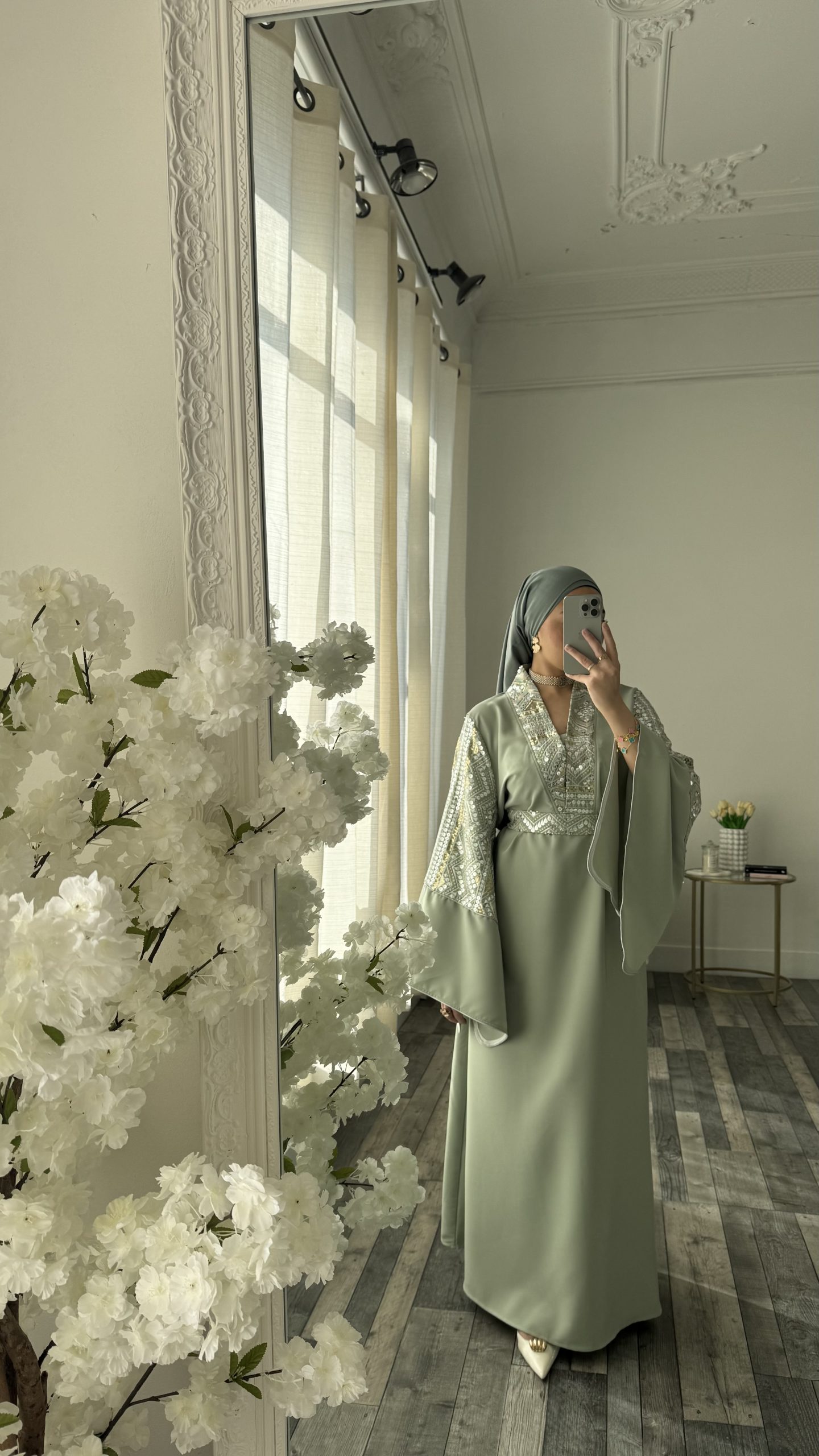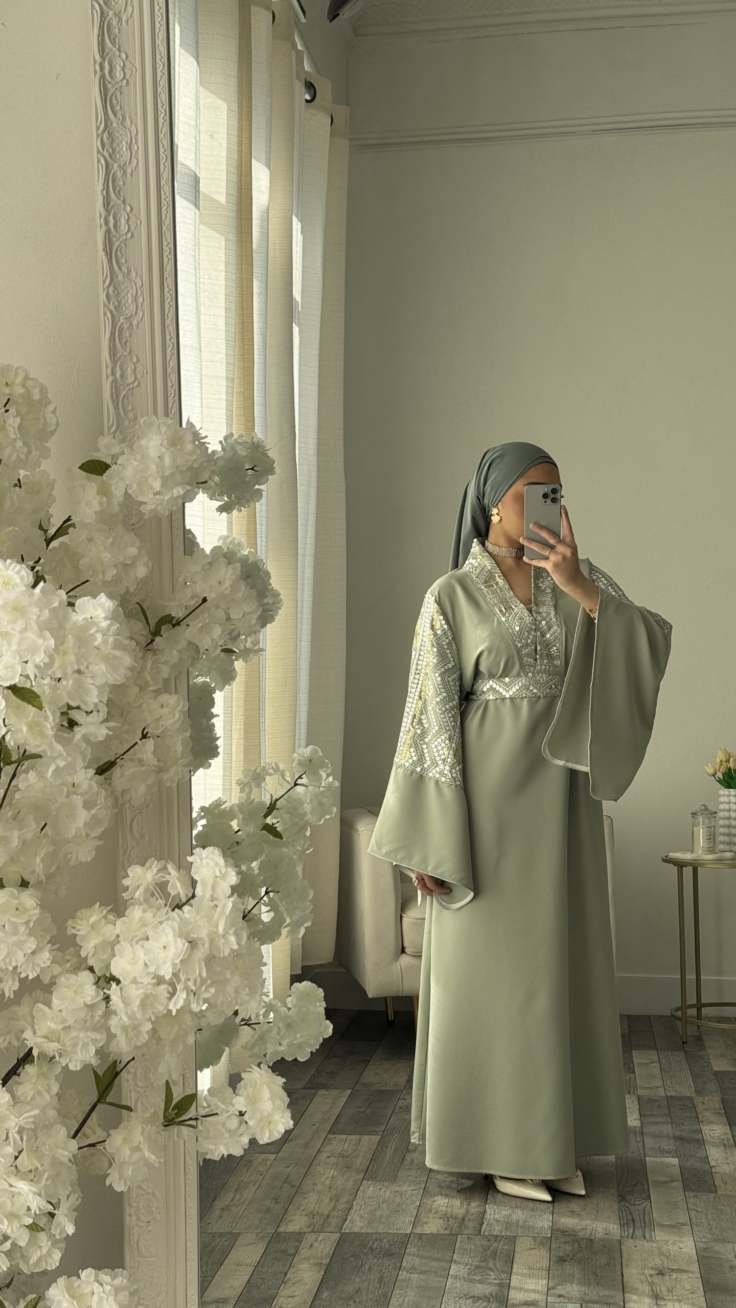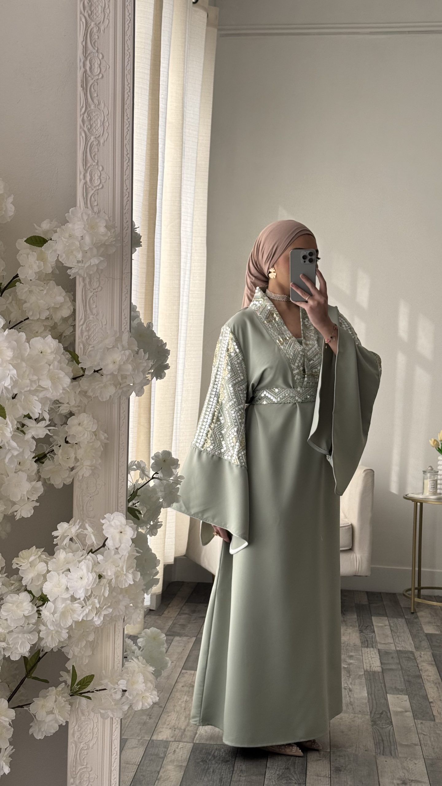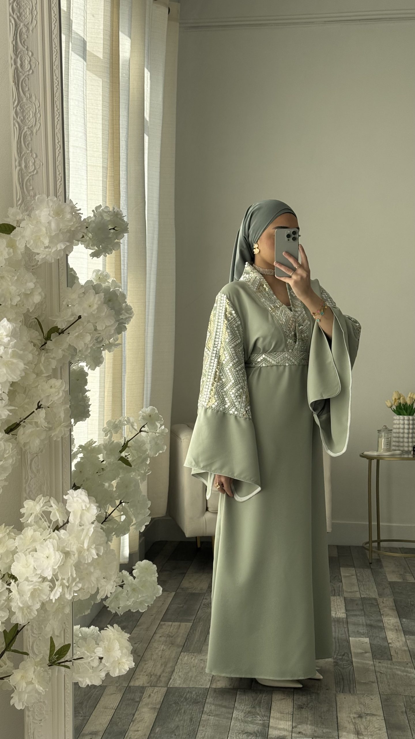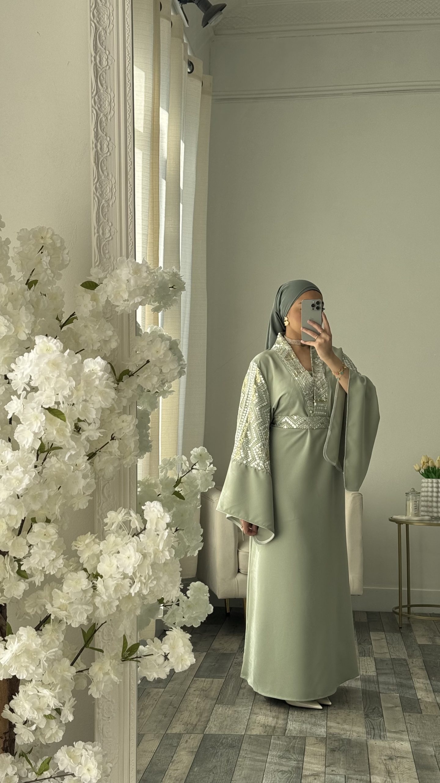 La Abaya Kuwaiti se distingue par sa couleur vert sauge, une couleur douce et lumineuse parfaite pour une allure élégante. Elle est ornée de strass et de broderies raffinées au niveau du buste et des manches qui apportent une touche de sophistication. Sa coupe fluide avec ses manches larges offre confort et élégance pour toute les occasions.