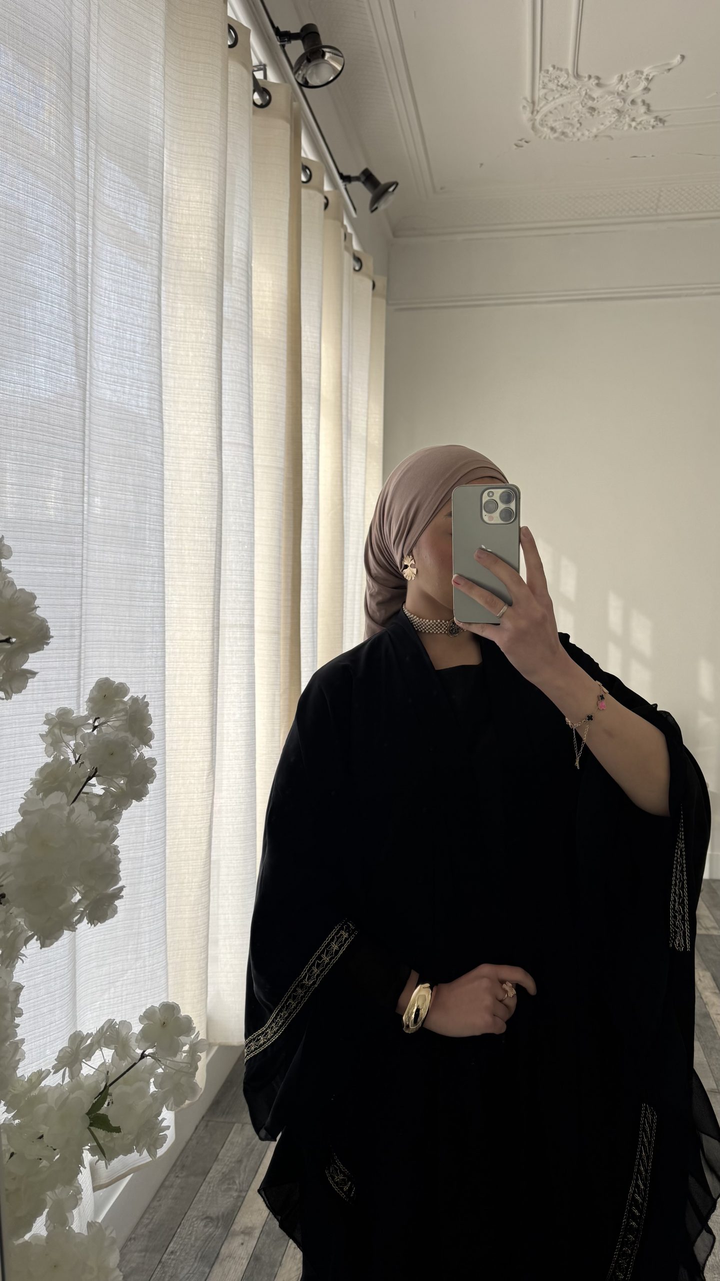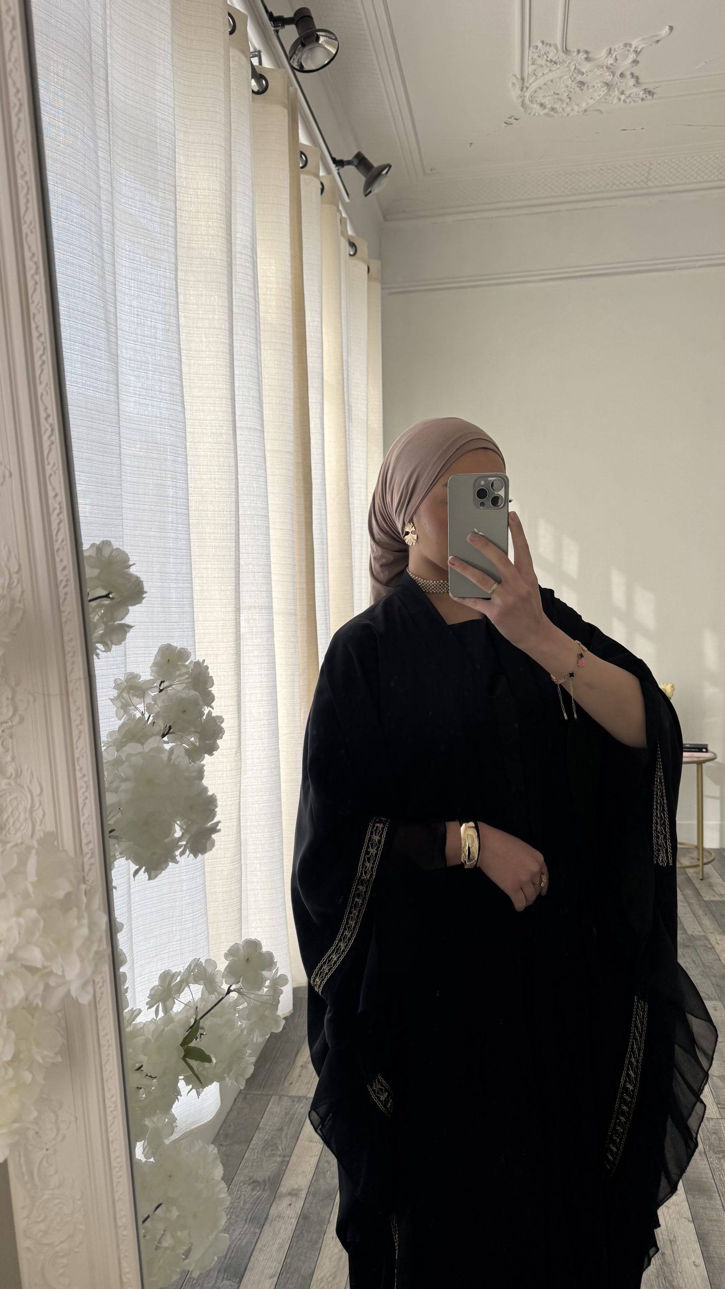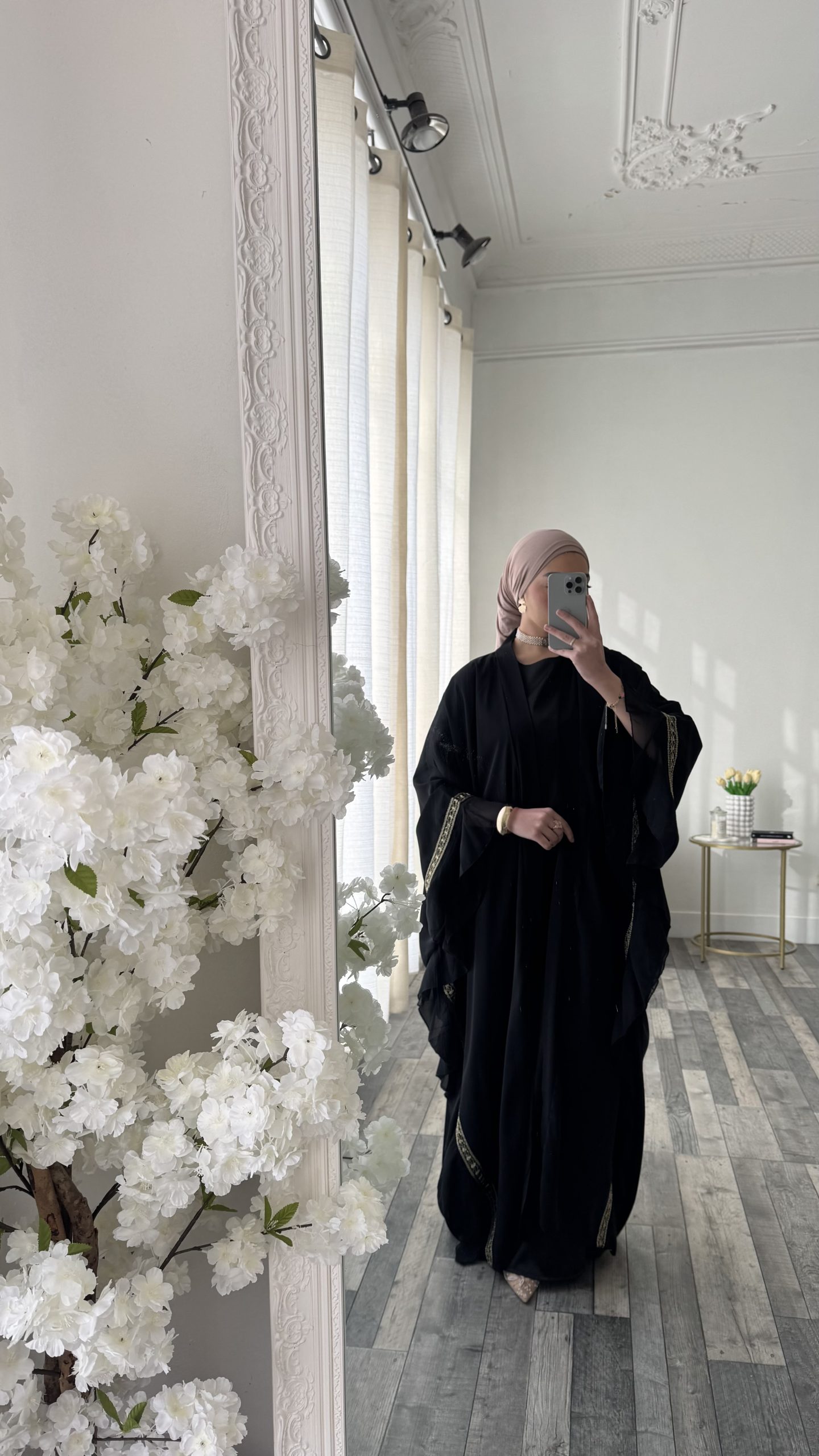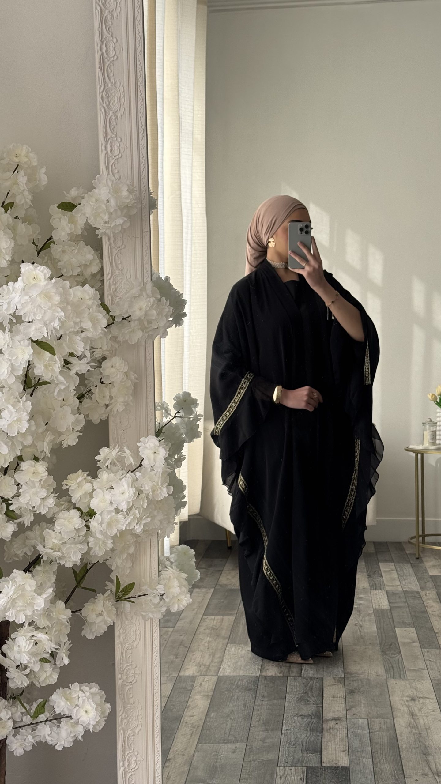 Le Kimono papillon long au tombé fluide et élégant doté de manches larges effet papillon qui apportent légèreté et mouvement à la silhouette. Ses délicates finitions dorées subliment le tissu noir pour une allure à la fois chic et raffinée. Une pièce intemporel ,parfaite pour un look élégant et modeste.