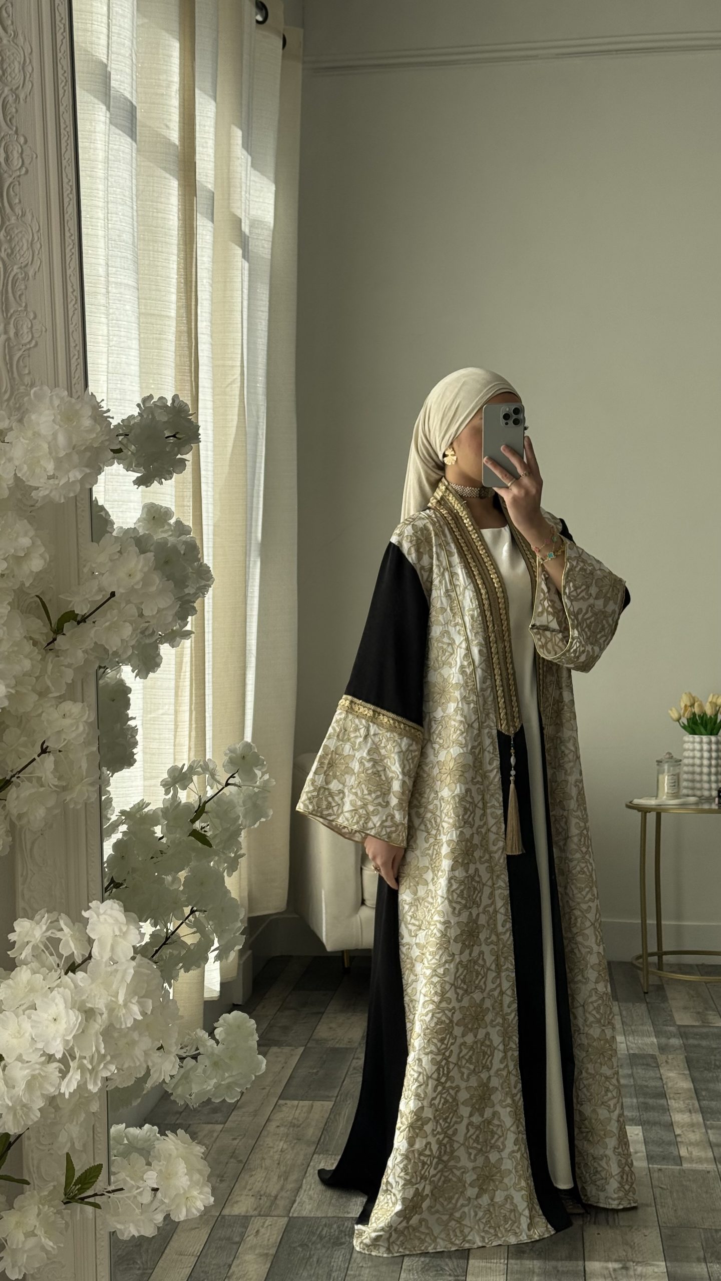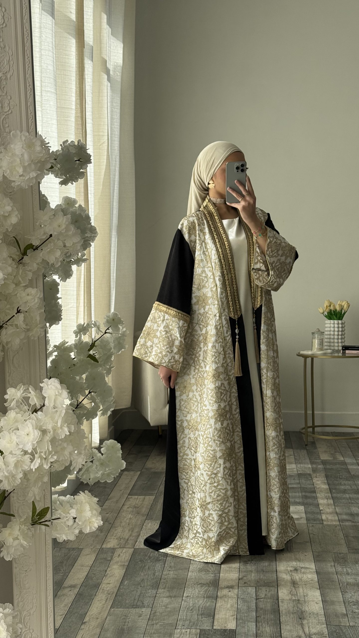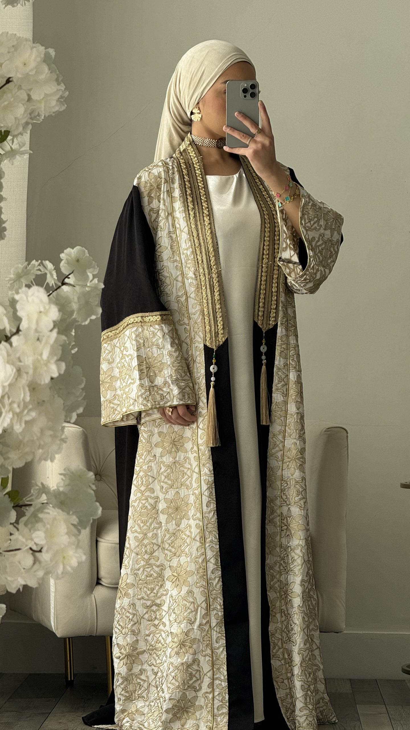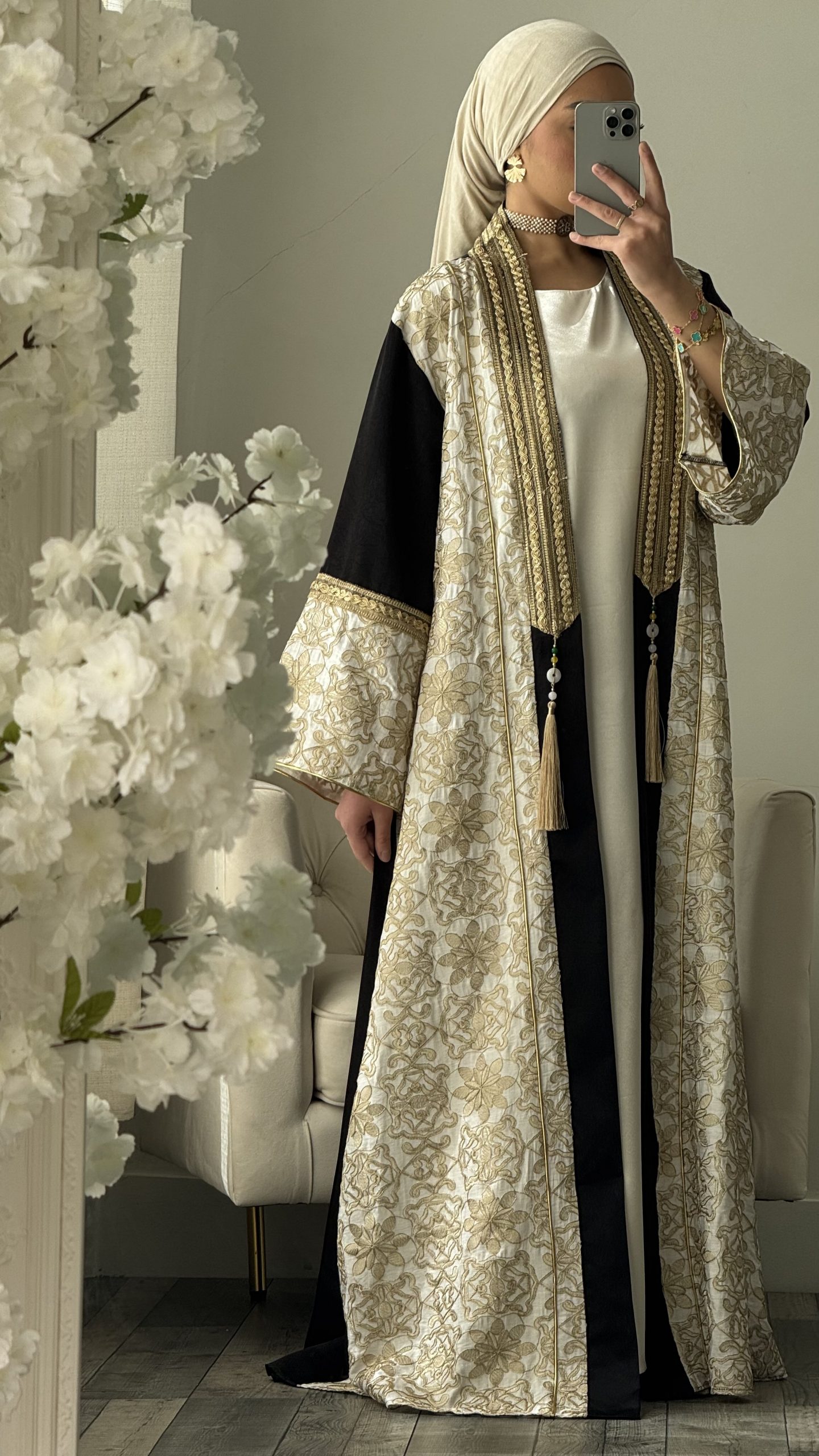 Ce set raffiné se compose d’un kimono noir sublimée par de somptueuses broderies florales en fil d’or sur fond ivoire ainsi que d’une sous robe manche courte en satin de couleur ivoire. Les manches larges du kimono apportent à la tenue une touche noble et sophistiquée. Le Set Impérial est un modèle chic et majestueux idéal pour vos occasions les plus spéciales.