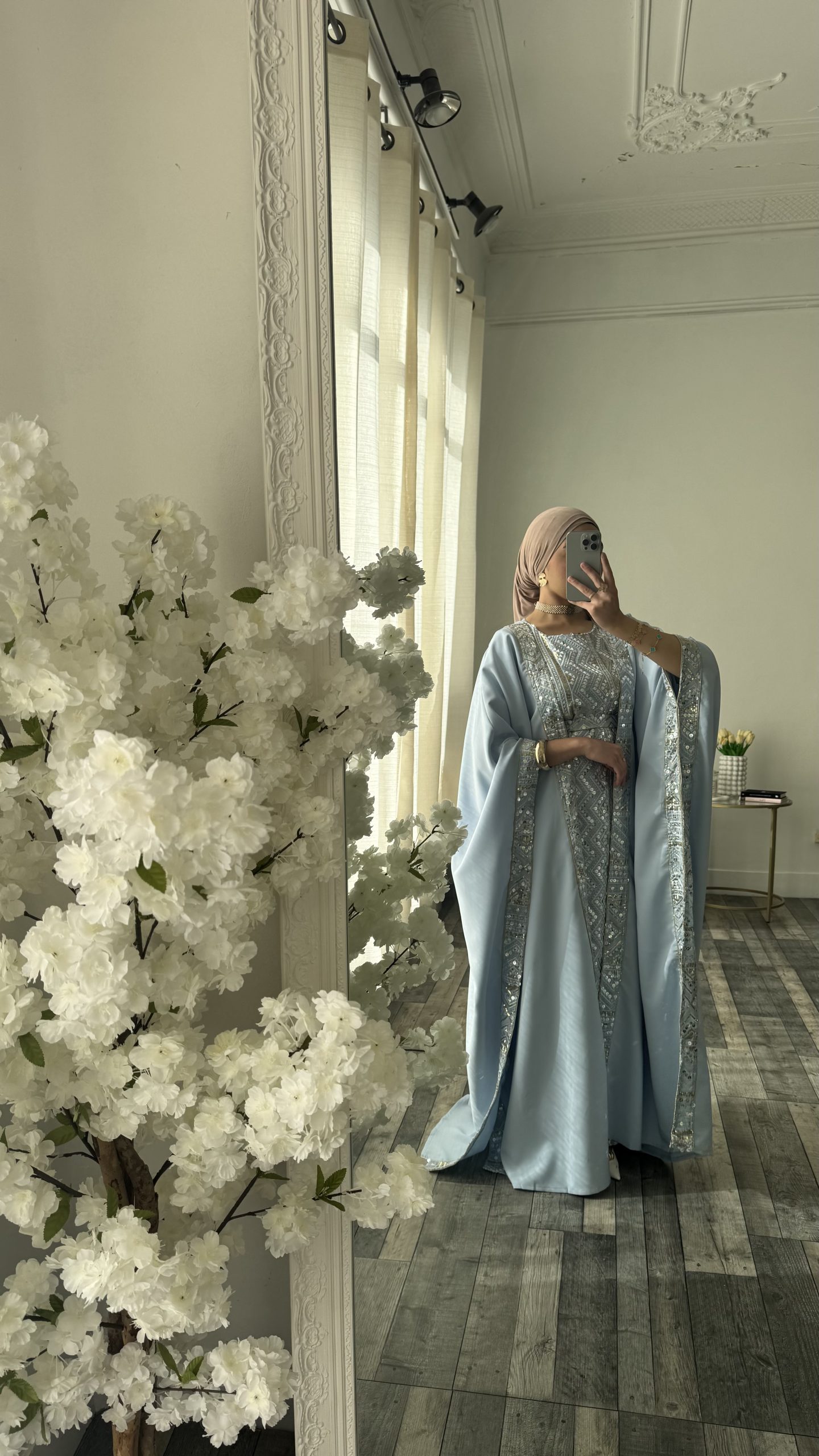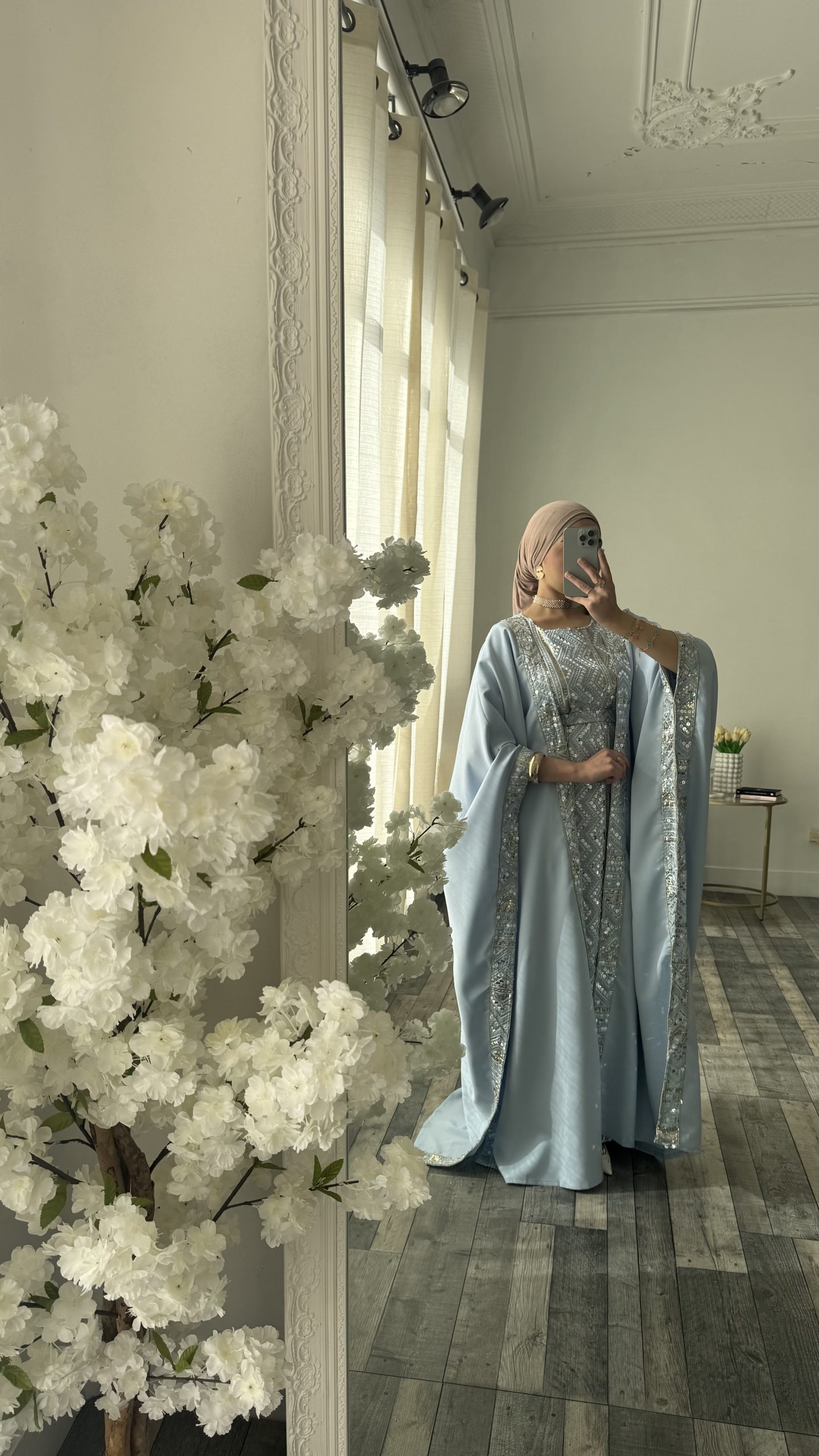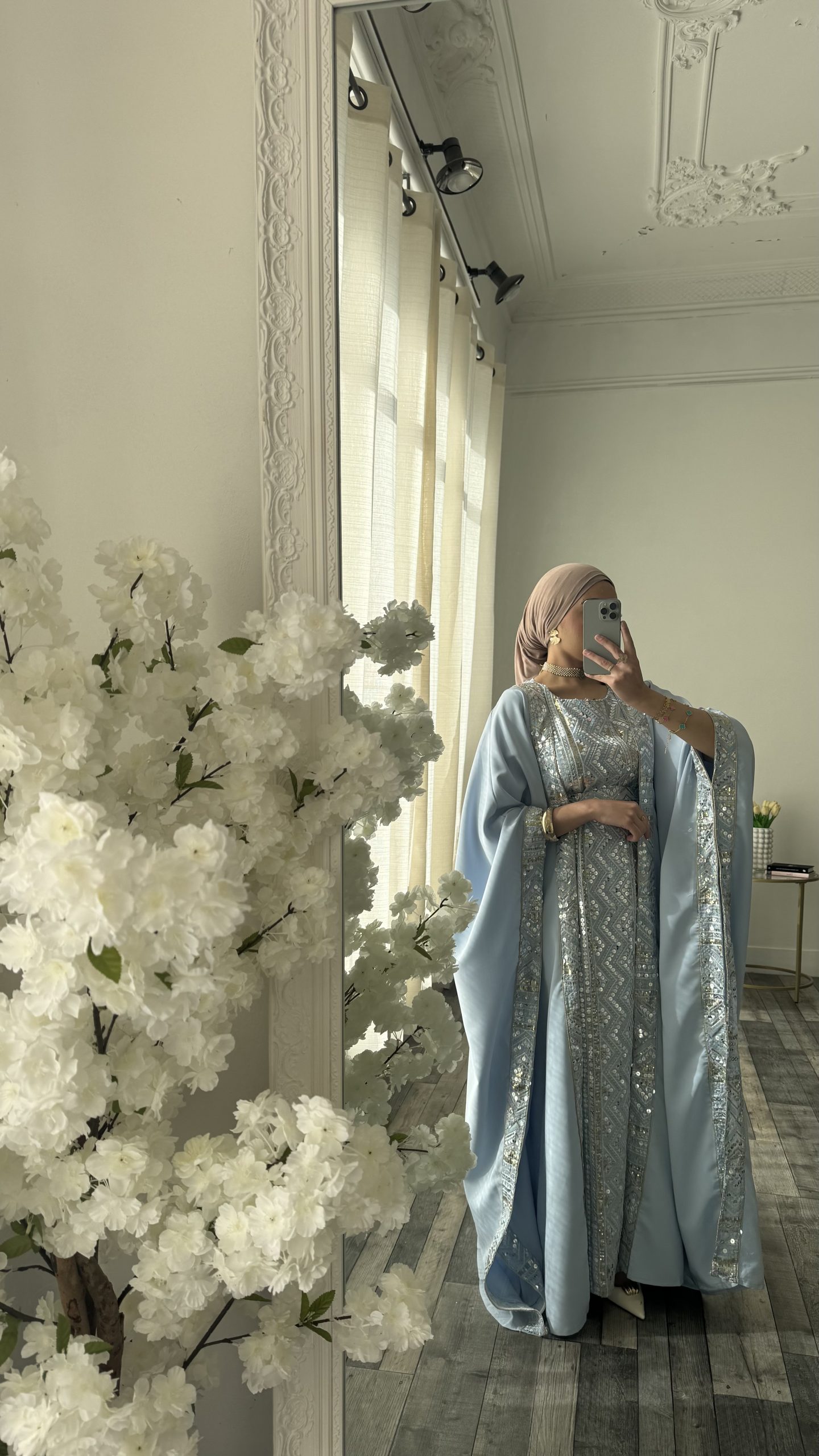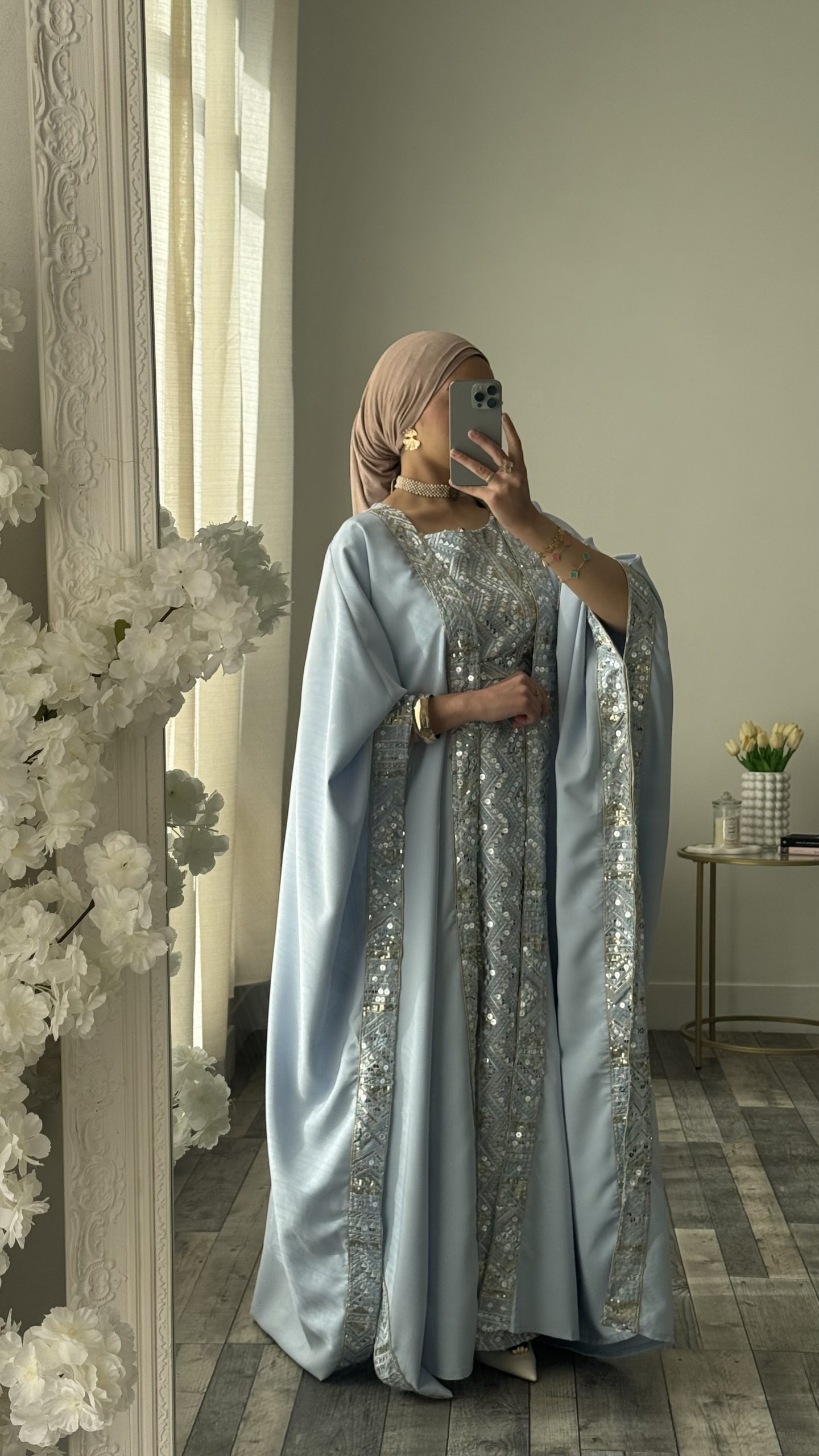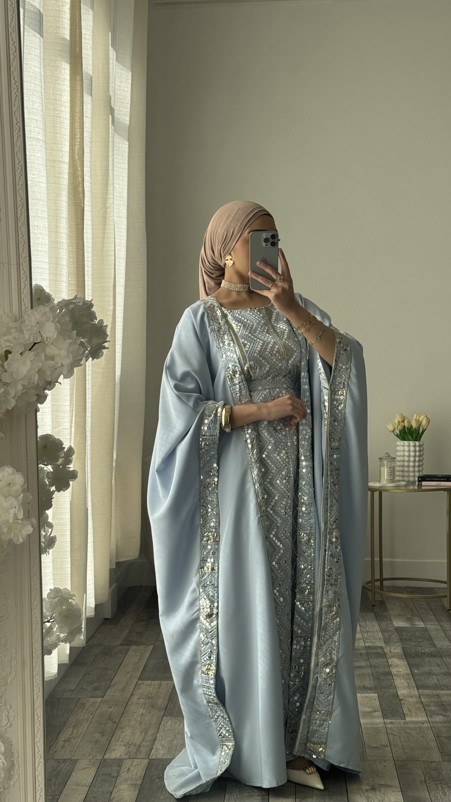 Ensemble élégant et raffiné composé d’une sous robe coupe manche courte et de son kimono assorti dans une teinte bleue. Le kimono, à la coupe ample et aux manches larges est sublimé par des finitions brodées le long des bordures pour une harmonie parfaite avec la robe.
